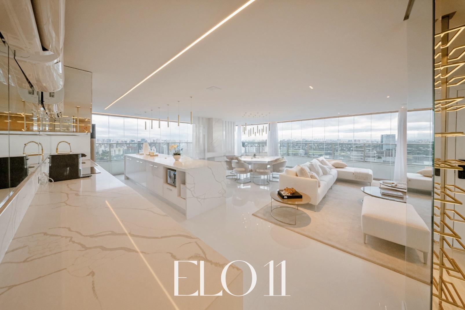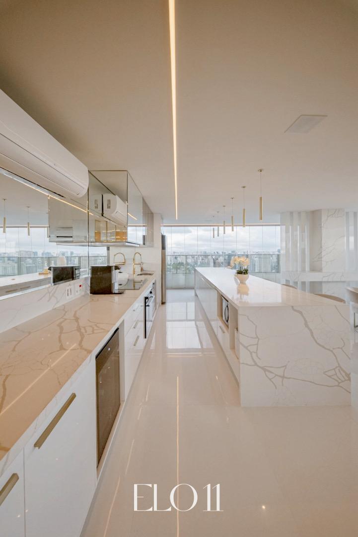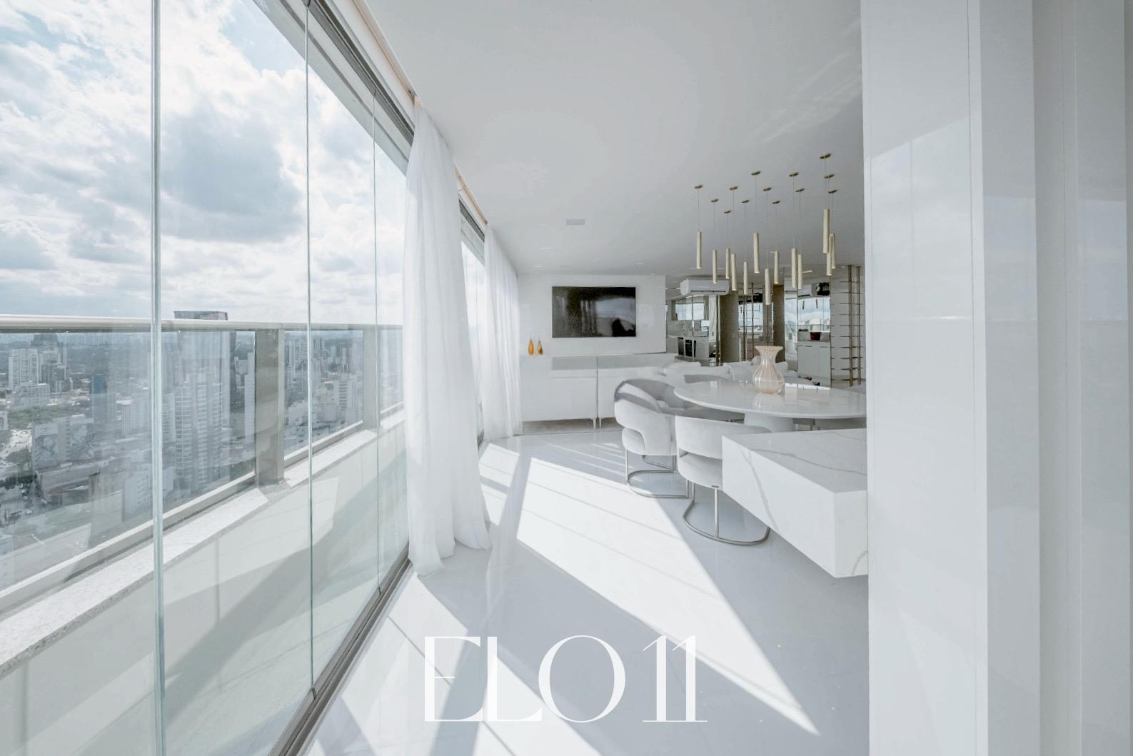 A penthouse conta com revestimentos em porcelanato e uma linha de eletrodomésticos Home Pró de última geração. Com envidraçamento 180o do piso ao teto, a vista panorâmica da cidade de São Paulo se revela de qualquer ponto do imóvel. Além disso, há um espaço de contemplação exclusivo, criado especialmente para observar a melhor vista da cidade, proporcionando uma experiência única e relaxante. A área de jantar e a bancada foram