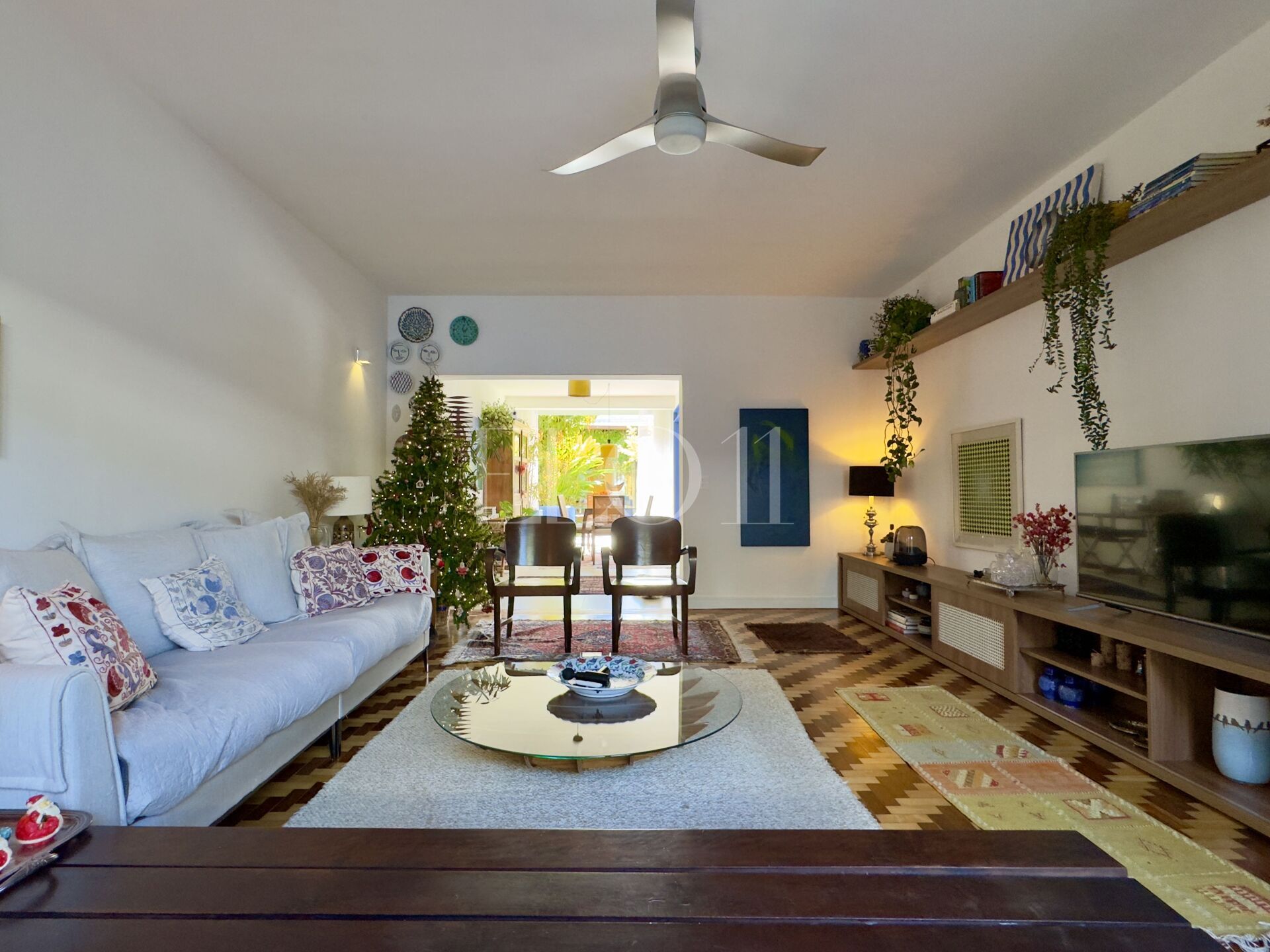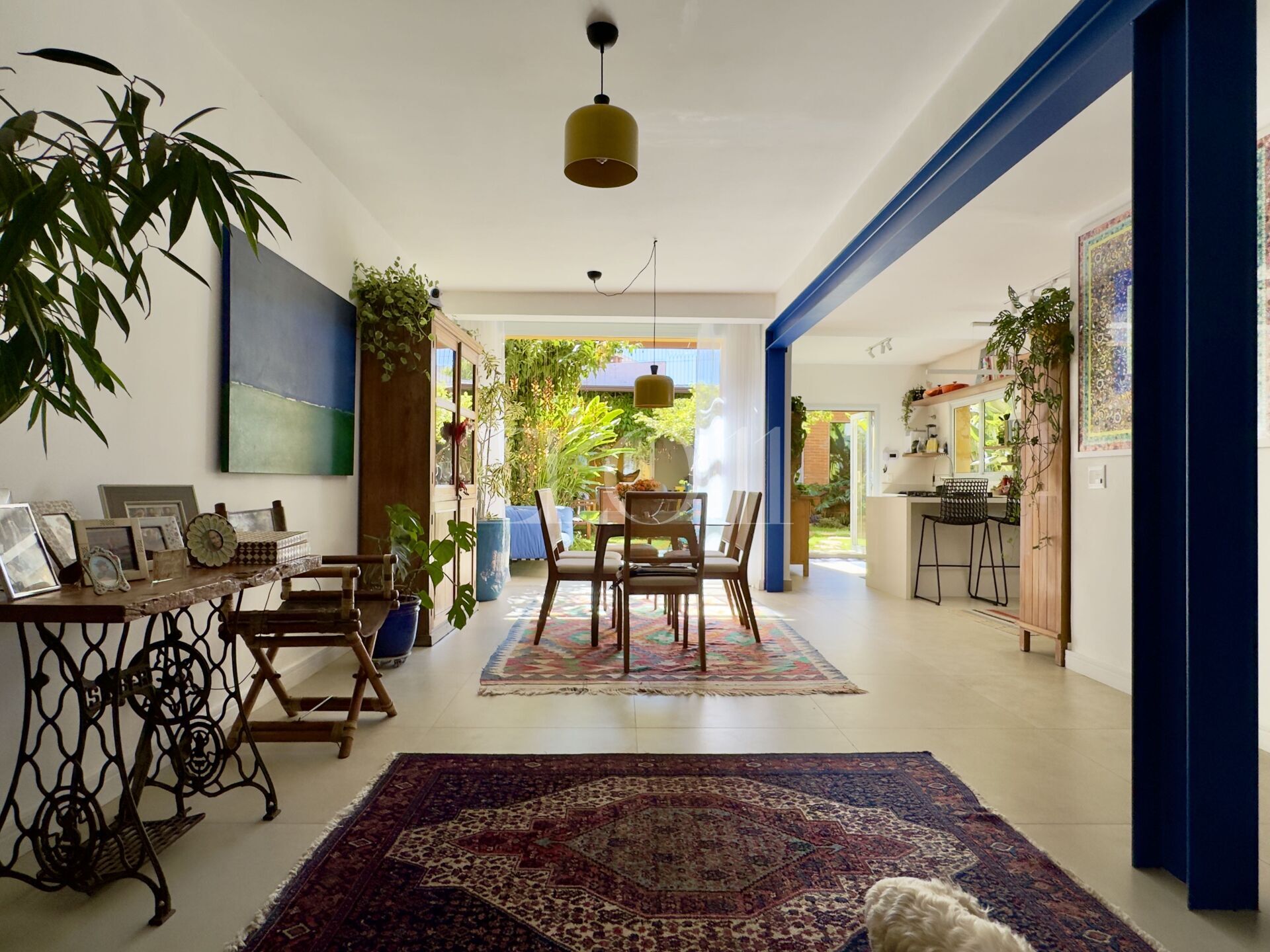 a casa foi reformada há pouco tempo abrindo e integrando os ambientes sociais, de tal forma que da entrada é possível ver o jardim ao fundo.